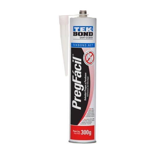 PREG FÁCIL BASE SOLVENTE | CARTUCHO 300G TEKBONDPREG FÁCIL BASE SOLVENTE | CARTUCHO 300G TEKBONDÉ um adesivo multiúso criado para substituir pregos e parafusose, assim, evitar furos indesejáveis em paredes.Recomendado para a fixação de objetos sem danificá-los, com avantagem de que evita parafusos e pregos aparentes- Características: :: Monocomponente:: Fácil de aplicar:: Elimina uso de pregos e parafusos:: Evita sujeiras desnecessárias no ambiente:: Cura a temperatura ambiente:: Excelente aderência e alta viscosidade:: Pode ser utilizado em paredes do tipo Dry Wall e compensado de madeira:: Uso interno e externo- Características::: Aparência (visual): Pasta tixotrópica bege com odor característico:: Tempo de formação de película: = 20 minutos:: Densidade a 25 °C: 1,20 a 1,50g/mL:: Temperatura ideal de aplicação: + 5 a 50°C:: Temperatura de trabalho: - 30 a 70°C:: Resistência ao cisalhamento, após 2 horas: 7 Kg/cm2:: Resistência ao cisalhamento, após 24 horas: 11 Kg/cm2:: Teor de sólidos: 82 %:: Tempo de armazenamento 5 a 25 °C: 18 mesesQUANTIDADE: 1 UNIDADESPESO:300 GCODIGO:72534REFERENCIA: 22201007300*IMAGEM MERAMENTE ILUSTRATIVA*