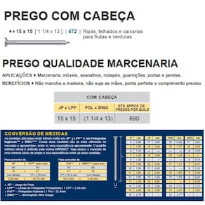 DADOS TÉCNICOS: Dimensão (JP x LPP): 15 x 15. Dimensão (pol. x BWG): 1.1/4 x 13. Quantidade aproximada de pregos por kg: 777. Conteúdo: Caixa com 20 pacotes de 1 kg cada.