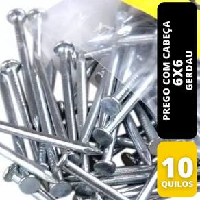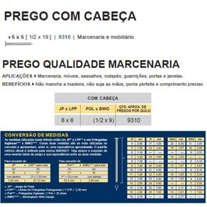 Prego com cabeça 6x6 - [1/2x19] - marcenaria e mobiliário Descrição: ????O Prego com cabeça possui corpo liso, cabeça cônica e axadrezada e ponta tipo diamante. Aplicações: Construção de todos os tipos; Confecção de estruturas temporárias; Construções Pesadas; Marcenaria; Embalagens; Caixarias; Pontes; Mata-burros e Porteiras. Benefícios: Maior rendimento por quilo e Maior giro no Ponto-de-Venda. Dimensão (JP x LPP): 6 x 6. Dimensão (pol. x BWG): 1/2 x 19. Quantidade aproximada em 1kg: 9370. Conteúdo: Caixa com 10 pacotes de 1 kg cada.