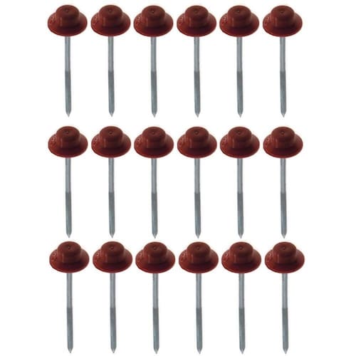 Características Técnicas: - Cor: Vermelho/Marrom - Material: Aço carbono de alta qualidade totalmente zincado para resistência à corrosão - Cabeça de plástico - HDPE de Polietileno - Estabilização UV: - Color Masterbatch: 2-3% - Diâmetro da cabeça: 18 mm
