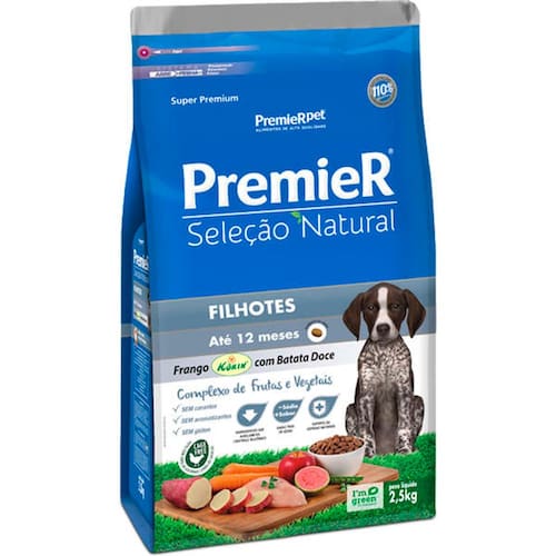 Ração Premier Seleção Natural Cães Filhotes Raças Médias Frango Com Batata Doce 2,5kg- Baixo teor de sódio: preserva o sabor natural dos ingredientes; - Suporte às defesas naturais: associação de vitaminas e minerais; - Ingredientes ricos em antioxidantes que auxiliam no combate aos radicais livres; - Complexo de Fibras e Vegetais: ingredientes selecionados como fontesnaturais de fibras e sais minerais que nutrem de maneira saudável.