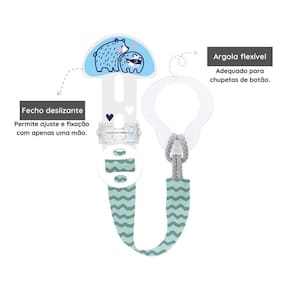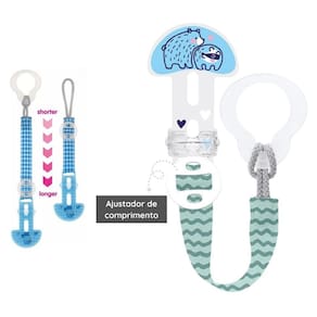 Características Técnicas: Cor predominante: azul Animal estampado: urso e texugo Acompanha Protetor de bico para a chupeta Com o clipe o comprimento pode ser ajustado de acordo com a necessidade Com a sua alça flexível é fácil e rápido prender chupetas, mordedores, brinquedos e outros O anel é fácil de remover permitindo prender chupetas MAM bem como outras chupetas O mecanismo do clipe pode ser aberto automaticamente puxando a peça deslizante para trás, tornando fácil de operar com apenas uma mão