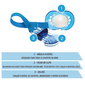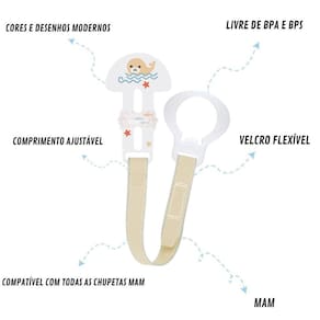 Com a sua alça flexível é fácil e rápido prender chupetas, mordedores, brinquedos e outros