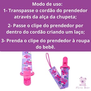 MODO DE USO 1. Transpasse o cordão do prendedor pela alça da chupeta do bebê. 2. Passe a ponta do prendedor por dentro do cordão para criar um pequeno laço. 3. Para fixar na roupa do bebê, empurre para frente a pequena trava retangular na base do prendedor para destravá-lo. 4. Posicione o prendedor na roupa do bebê e pressione para trás a trava retangular até ouvir um pequeno clique, garantindo que o prendedor esteja fechado e bem fixado.