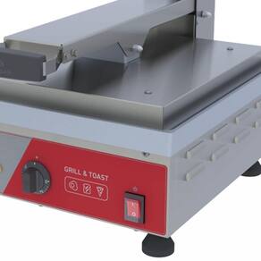 DESCRIÇÃO DO GRILL ELÉTRICO PRA-45 E 220 V - Estrutura em aço inox escovado; - Aquecimento inferior e superior através de resistências elétricas blindadas e controladas por termostato; - Lâmpada Piloto indicando a função liga e desliga a resistência - Coletor de gordura que facilita a higienização; - Chapas em alumínio fundido; - Pés antiderrapantes; - Regulagem de abertura da presa pão; - Sistema que mantém a prensa pão elevada, quando a mesma estiver aberta.