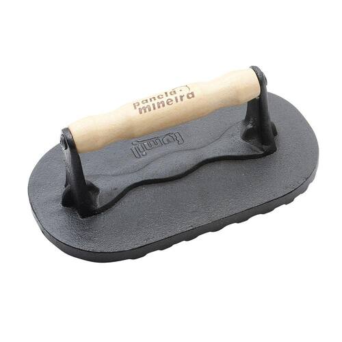 Prensador de Carnes Ferro Fundido 20 cm de comprimento por 12 cm de largura com alça de madeira que não esquentam. Peso 2,0 kg. Possui estrias para grelhar carne. Acelera o preparo dos alimentos. A alça de madeira reduz a condução do calor protegendo as mãos, além de estar em conformidade com as novas regras da vigilância sanitária tendo em vista que melhora a higienização do utensílio.