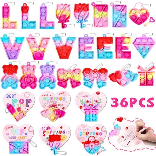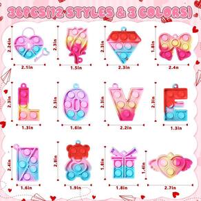 -?PRESENTES DE DIA DOS NAMORADOS, CHAVEIROS POP?Nossas lembrancinhas de Dia dos Namorados em massa contêm 36 chaveiros pop, brinquedos e cartões de Dia dos Namorados de 6 estilos em formato de coração. Nossos chaveiros pop estão em 3 cores românticas e 12 estilos, incluindo flores, coração, AMOR, etc. Eles são ótimos presentes de dia dos namorados para crianças em sala de aula.