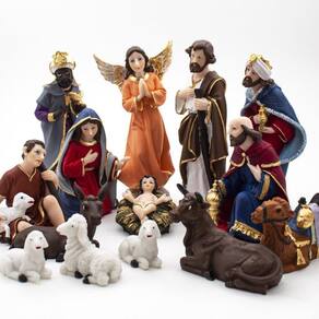 Presépio 2 Resina 14 Peças 15 cm Presépio, do latim Praesaepe, significa estrebaria ou curral. É um gesto que ajuda a preparar a celebração do nascimento de Jesus. Geralmente é formado pelo menino Jesus, Maria, José, os Reis Magos, o anjo, os pastores e os animais. Produto pintado a mão, podendo sofrer variações de cores. Marca: Amém Decoração Religiosa
