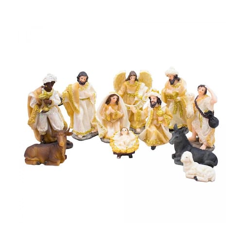 Presépio Bege 11 Peças 12cm De Altura Completo Resina Enfeite decorativo em forma de imagem de presépio com 11 peças, cor bege claro. A peça mais alta possui 12 cm. Material: resina Informação Adicional Código ALJ21B883-4-E Peso Kg 2.00 Altura cm 20.00 Largura cm 20.00 Comprimento cm 20.00 Certificado Não se aplica Ean: 4894290038814