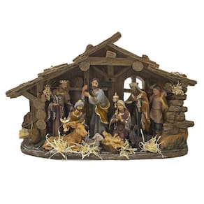 Esse presépio é composto pelo menino Jesus, Maria, José, os Reis Magos, o anjo, os pastores e os animais, trazendo todos os personagens essenciais para a representação do nascimento de Jesus. Cada detalhe foi cuidadosamente esculpido, resultando em uma aparência realista e cheia de significado.