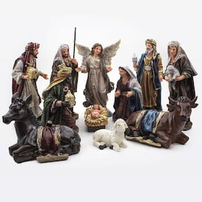 Presépio Resina 11 Peças 23 cm Presépio, do latim Praesaepe, significa estrebaria ou curral. É um gesto que ajuda a preparar a celebração do nascimento de Jesus. Geralmente é formado pelo menino Jesus, Maria, José, os Reis Magos, o anjo, os pastores e os animais. Dimensões: Menino Jesus: Altura: 6 cm - Largura: 7 cm - Profundidade: 6 cm Maria: altura: 15 cm - Largura: 9 cm - Profundidade: 9 cm José: altura: 23 cm - Largura: 9 cm - Profundidade: 7 cm Anjo: altura: 22 cm - Largura: 13 cm - Profundidade: 7 cm Baltazar: altura: 16 cm - Largura: 9 cm - Profundidade: 9 cm Gaspar: altura: 21 cm - Largura: 8 cm - Profundidade: 8 cm Melchior: altura: 21 cm - Largura: 9 cm - Profundidade: 9 cm Pastor: altura: 20 cm - Largura: 8 cm - Profundidade: 9 cm Burro: altura: 11 cm - Largura: 12 cm - Profundidade: 7 cm Vaca: altura: 10 cm - Largura: 13 cm - Profundidade: 9 cm Ovelha: altura: 6 cm - Largura: 7 cm - Profundidade: 4 cm Dimensões aproximadas do produto. Produto fabricado a mão, podendo sofrer variações de cores. Marca: Não Informado
