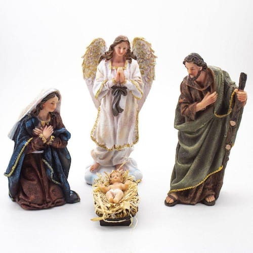Presépio Importado Resina 4 Peças 20 cm Presépio, do latim Praesaepe, significa estrebaria ou curral. É um gesto que ajuda a preparar a celebração do nascimento de Jesus. Geralmente é formado pelo menino Jesus, Maria, José, os Reis Magos, o anjo, os pastores e os animais.Dimensões:Menino Jesus: Altura: 5 cm - Largura: 5 cm - Profundidade: 7 cmMaria: altura: 14 cm - Largura: 9 cm - Profundidade: 9 cmJosé: altura: 18 cm - Largura: 9,5 cm - Profundidade: 8,5 cmAnjo: altura: 20 cm - Largura: 10 cm - Profundidade: 6,5 cm Dimensões aproximadas do produto.Produto fabricado a mão, podendo sofrer variações de cores. Marca: Amém Decoração Religiosa