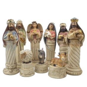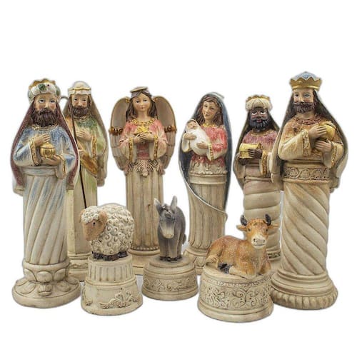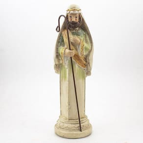 Presépio Importado Resina 9 Peças 28 cm Presépio, do latim Praesaepe, significa estrebaria ou curral. É um gesto que ajuda a preparar a celebração do nascimento de Jesus. Geralmente é formado pelo menino Jesus, Maria, José, os Reis Magos, o anjo, os pastores e os animais.Dimensões:Maria: altura: 27 cm - Largura: 9 cm - Profundidade: 9 cmJosé: altura: 28 cm - Largura: 9 cm - Profundidade: 9 cmAnjo: altura: 27 cm - Largura: 9 cm - Profundidade: 8,5 cmBaltazar: altura: 26 cm - Largura: 8 cm - Profundidade: 8,5 cmGaspar: altura: 27 cm - Largura: 8 cm - Profundidade: 8,5 cmMelchior: altura: 27 cm - Largura: 8 cm - Profundidade: 8,5 cmBurro: altura: 13 cm - Largura: 7 cm - Profundidade: 7 cmVaca: altura: 12 cm - Largura: 8 cm - Profundidade: 9 cmOvelha: altura: 13 cm - Largura: 7 cm - Profundidade: 7 cmDimensões aproximadas do produto.Produto fabricado a mão, podendo sofrer variações de cores. Marca: Amém Decoração Religiosa