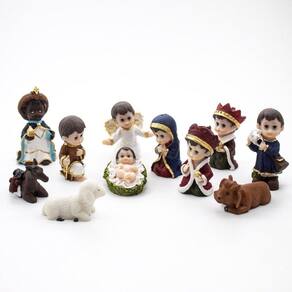 Presépio Infantil Resina 11 Peças 6 cm Presépio, do latim Praesaepe, significa estrebaria ou curral. É um gesto que ajuda a preparar a celebração do nascimento de Jesus. Geralmente é formado pelo menino Jesus, Maria, José, os Reis Magos, o anjo, os pastores e os animais. Produto pintado a mão, podendo sofrer variações de cores. Marca: Não Informado