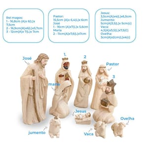 Cada figura, cuidadosamente esculpida e pintada, representa personagens tradicionais do presépio, como maria, josé, o menino jesus, os pastores e os reis magos, além de outros detalhes típicos como animais e a manjedoura.