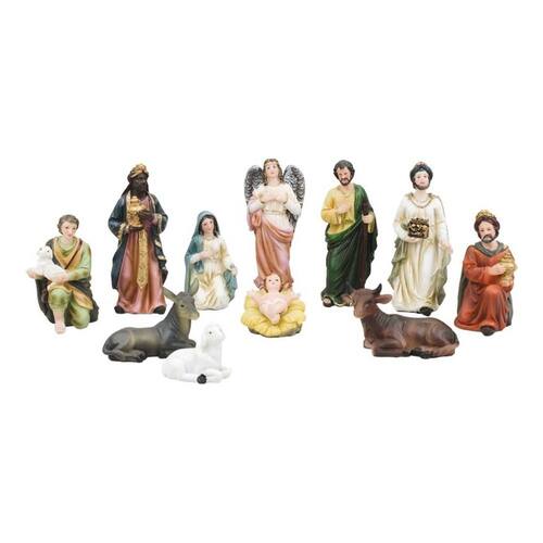 Presépio De Natal Realista Em Resina 11 Peças 12 Cm' é um enfeite decorativo em forma de presépio com 11 peças, apresentando cores reais. Este presépio realista inclui o Menino Jesus removível da Manjedoura, Maria, José, Pastor, 3 reis magos Melquior, Baltazar e Gaspar, Anjo, Burro, Boi e Ovelha. A peça mais alta, o mago, tem 12 cm de altura.