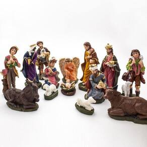 Presépio Resina 14 Peças 12 cm Presépio, do latim Praesaepe, significa estrebaria ou curral. É um gesto que ajuda a preparar a celebração do nascimento de Jesus. Geralmente é formado pelo menino Jesus, Maria, José, os Reis Magos, o anjo, os pastores e os animais.Produto pintado a mão, podendo sofrer variações de cores. Marca: Amém Decoração Religiosa