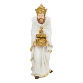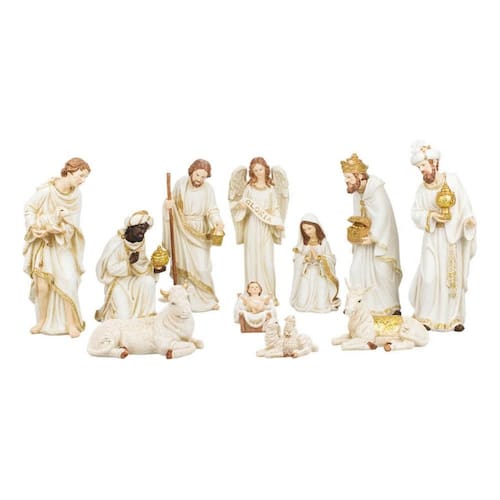 Enfeite decorativo na imagem do Presépio de vestimenta branca com 11 peças, sendo o mago a peça mais alta com 32 cm de altura. As peças que formam o Presépio são: Menino Jesus removível da Manjedoura, Maria, José, Pastor, 3 reis magos Melquior, Baltazar e Gaspar, Anjo, Burro, Boi e Ovelha. Tamanhos proporcionais a peça mais alta. Material: resina Código AS351586-1-M Peso (Kg) 5.80 Altura (cm) 30.00 Largura (cm) 60.00 Comprimento (cm) 40.00 Marca: Não Informado