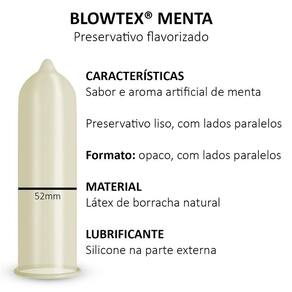 Preservativo Blowtex Menta Leve 9 Pague 6 unidades Blowtex menta tem o irresistível sabor e aroma de menta e ajuda a estimular todos os sentidos. Tenha muito mais prazer: no clima quente, uma sensação refrescante. Todos os preservativos são testados eletronicamente. Nessa embalagem, leve 9 preservativos pelo preço de apenas 6. - Compre produtos Blowtex