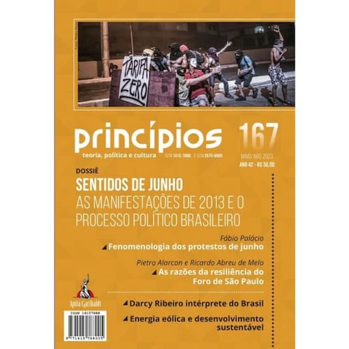 Princípios 167 traz uma análise das motivações, das formas orgânicas, das reivindicações e propostas, bem como dos desdobramentos das revoltas de 2013. O dossiê “Sentidos de Junho” foca, de modo particular, as relações do movimento com o campo político. Trata-se de questão crucial, pois, como afirma Fábio Palácio no artigo que abre o dossiê desta edição, e que antecipa partes de seu livro sobre o tema, a ser lançado em agosto, “a chave para a compreensão das manifestações reside na luta política que se travava — e ainda se trava — na sociedade brasileira”. A edição parte do pressuposto de que o movimento abrigou desde sempre uma pluralidade de atores e perspectivas que fazem com que conserve, ainda hoje, certa abertura de sentidos. Para o entendimento dessa problemática são mobilizadas contribuições que examinam o episódio a partir de múltiplas perspectivas e de campos disciplinares diversos. As abordagens se ligam a variadas disciplinas das ciências sociais, incluindo a Sociologia e áreas correlatas, como a Ciência Política, a História, a Comunicação, a Filosofia, as Relações Internacionais e outras com igual potencial de desvendamento dos sentidos de Junho. Esta edição de Princípios se completa com artigos sobre distintos temas, todos eles de grande atualidade: as múltiplas dimensões da obra do antropólogo Darcy Ribeiro; as relações entre os trabalhos do escritor romântico José de Alencar e seus posicionamentos políticos; a atuação do Foro de São Paulo, organização internacionalista de partidos progressistas e de esquerda latino-americanos e caribenhos cujo último encontro acaba de se realizar em nosso país; o funcionamento das altas castas do Judiciário brasileiro e sua relação com novas formas de patrimonialismo.