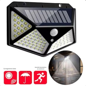 Especificações: Potência: 20w Luminosidade: 600lm Quantidade de leds: 100 Ângulo de iluminação: 270º Ângulo do sensor de presença: 120º Fonte de alimentação: solar Distância do sensor: 3-5m Classe de proteção: ip65 Material: abs Autonomia da bateria: 1200mah Cor do led: branco frio Tempo de uso: até 10h Tempo de carregamento: 2 - 7h no sol Resistente à água