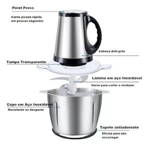 Processador de alimentos elétrico com corpo em aço inoxidável. Possui 2 níveis de velocidade mais função pulsar. Tigela de 3,8 litros.Acessórios