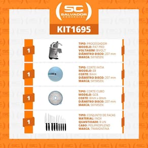 Processador de Alimentos Corte Fatias 8mm e Cubos 8mm PA7 PRO Bivolt Skymsen e Jogo de Facas 9 Peças