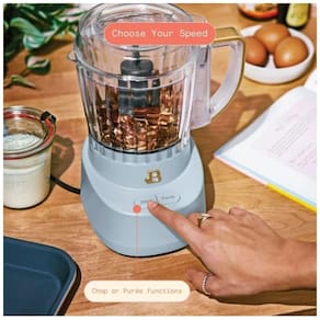 O mini processador de alimentos 3-Cup Food Chopper by Drew Barrymore, na cor rose, foi desenvolvido para preparo de pequenas porções em uso doméstico, com tigela de vidro de 3 xícaras adequada a receitas do dia a dia. O motor de 250W atua em conjunto com lâmina em aço inoxidável para picar, triturar e fazer purês de ingredientes como vegetais, ervas, nozes e bases de molhos.