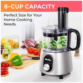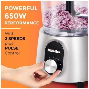 Processador de alimentos 3 em 1 com funções de picador, fatiador e ralador. Possui motor de 650W, 2 velocidades e função pulsar. Tigela com capacidade para 8 xícaras.Acessórios