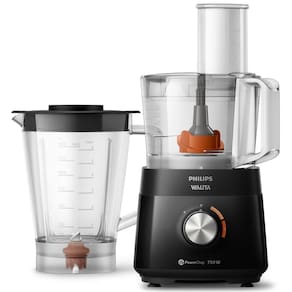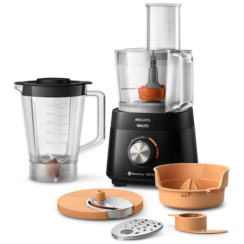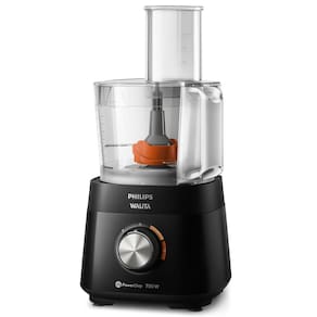 O Processador de Alimentos da Philips Walita acompanha 6 acessórios que facilitam muito a sua rotina: jarra de liquidificador, lâmina para ralar, lâmina para fatiar, espremedor de frutas, batedor de massas e faca processadora PowerChop, exclusiva tecnologia que combina 2 lâminas com ângulos de corte perfeito, muito mais fino e preciso.