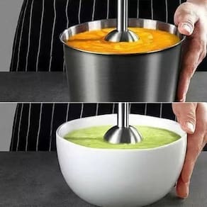 Mixer de mão portátil com 1000W de potência, 4 lâminas e ajuste de nível de velocidade. Ideal para papinhas de bebê, triturar gelos, misturar tomates, drinks, sopas e fazer milkshakes. Não indicado para alimentos densos como batatas, mandiocas e massas.Acompanha copo