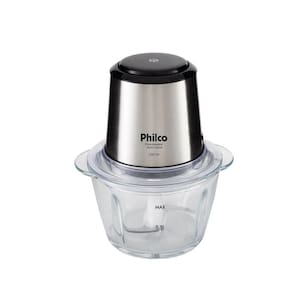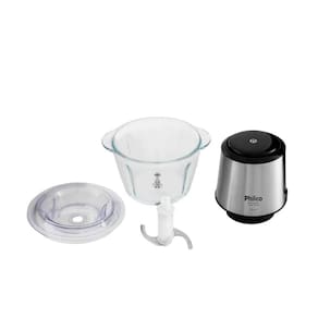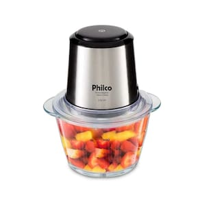 Processador Philco Inox Glass com copo de vidro de 1,2L e potência de 350W. Possui função pulsar e trava de segurança.Acessórios