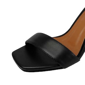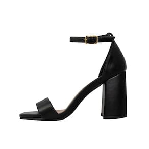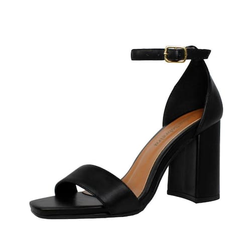 Linha de Sandália Salto Alto Grosso Luiza Sobreira, produzida em material sintético na cor Preta, com palmilha e forro em P.U., solado em TR, bico quadrado e fivela ajustável para fechamento..