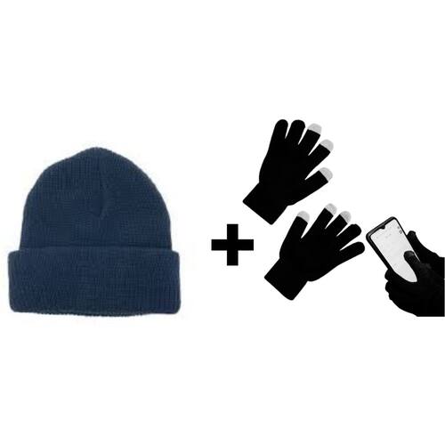 Kit Frio Touca Gorro De Lã Básica E Luva Touch Screen Mexer Celular Tablet Quentinha Inverno Intenso Unissex Adulto - Azul Marinho - Único