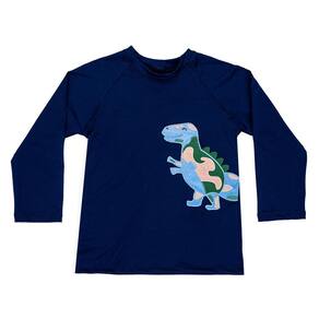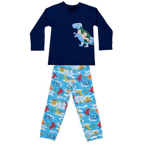 O pijama infantil com camiseta térmica e calça em soft é perfeito para o inverno. A camiseta possui aplique de dinossauro e a calça é estampada de dinossauros coloridos com fundo azul claro.