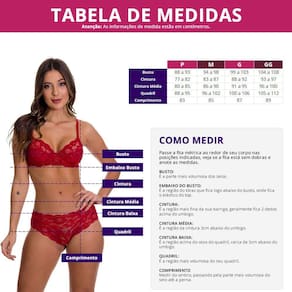Busto 99 a 103cm / Cintura 88 a 92cm / Cintura Média 91 a 95cm / Quadril 100 a 106cm / Comprimento 87