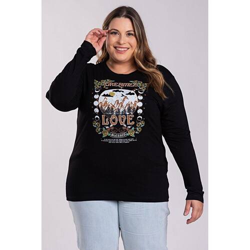Blusa Feminina Manga Longa Plus Size Visco Estampada "Dreamer Love" - Serena - Preto - G4