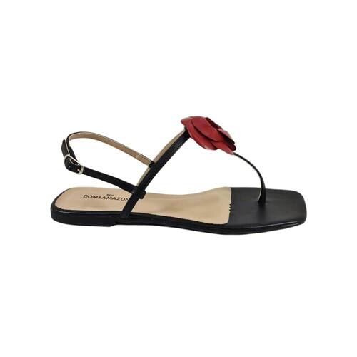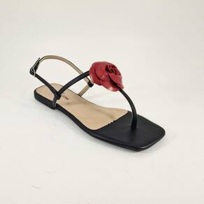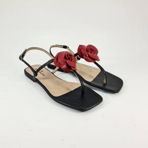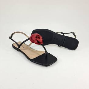 Sandália rasteira preta e flor vermelha.