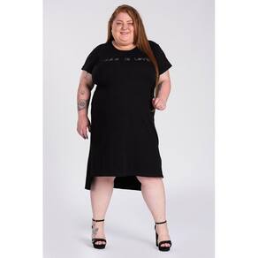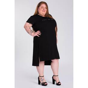 Vestido feminino plus size elaborado em tecido canelado. Possui boa elasticidade, leve, macio. Modelo que proporciona conforto alinhado ao charme de uma básico nada básico. Possui estampa na parte da frente, abertura nas laterais e a parte de trás mais alongada que a da frente estilo mulet.