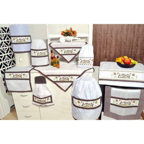 Itens para cozinha fabricados em tecido tergal branco, com barrado bordado em ponto cruz com uma mimosa vaquinha com borboletas nas cores marrom, verde e bege, com acabamentos em laise com poás e viés xadrez marrom.