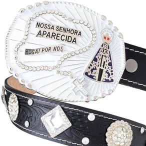 Cinto Couro Feminino Fivela Redonda Terço Nossa Senhora de Aparecida Detalhes Strass Brilho - Preto - 105