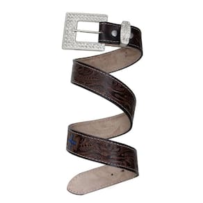 Cinto Boiadeira Couro Fivela Quadrada de Strass Texturizado Detalhe Cruz Festa do Peao Muladeiros - Marrom - 95