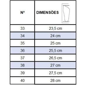 Recomendações de Uso: A limpeza do calçado pode ser feita com Detergente neutro e pano úmido. Não deixar submerso em água e não utilizar nenhuma forma de calor para secar. Guardar em local sem umidade.