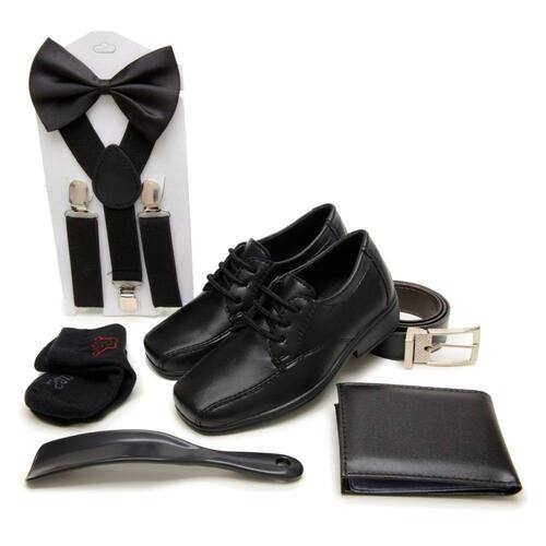 Kit Sapato Social Infantil Suspensorio Gravata Cinto Carteira Calçadeira Meia Pajem Casamento - 24 - Preto