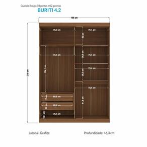 O Guarda-Roupa Buriti possui um design diferenciado e atemporal. São 4 portas, sendo 2 delas em MDF e com detalhe usinado ripado e puxadores pontuais em ABS para abertura. As demais portas em MDP seguem com puxadores em MDF revestido em formato grande. Internamente, possui 5 amplas prateleiras com muito espaço para guardar os pertences, 2 cabideiros em alumínio de excelente qualidade para pendurar as roupas, 2 gavetas com corrediças telescópicas que suportam muito mais peso, compartimento para guardar pertences de valor. Externamente, o acabamento é em textura Reverse semi fosco, suave ao toque, e que facilita a limpeza.
