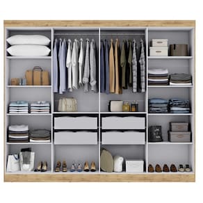 varões de aluminio e gavetas para auxiliar acomodação de pequenos objetos. Oferece beleza e modernidade a mais no produto. Possui quatro gavetas, amplo espaço interno com divisões ele/ela, para cabideiros, prateleiras e calçados, seu designer interno possibilita organizar todas as roupas e acessórios.