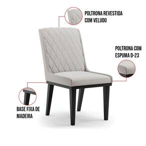 A Cadeira Sofia, é a opção ideal para quem quer um ambiente moderno e sofisticado! Um móvel super compacto, que se adequa perfeitamente em diversos ambientes. É uma ótima escolha para área de descanso, sala de estar, hall de entrada, espaço gourmet, varanda, recepção, escritório ou até mesmo para compor a mesa de jantar. Demais, né? Possui um design elegante, clássico e super convidativo, sem dúvidas ela dará um toque todo especial ao espaço que for posicionada. Feita em madeira maciça de eucalipto reflorestado, possui também base fixa em tom preto o que garante mais segurança, ótima sustentação e durabilidade à peça. O detalhe principal desta linda cadeira , fica por conta da alta-costura no encosto, em estilo matelassê. Um método aplicado no tecido de aparência acolchoada, o que confere um acabamento mais refinado à peça. Além do mais, os desenhos geométricos do tecido adicionam um toque luxuoso ao produto. Seu estofamento é feito com espuma D-23, revestida no Veludo, o que garante maciez e conforto, trazendo aquela sensação de abraço e suavidade ao sentar-se. Afinal, não há nada melhor do que relaxar em uma Cadeira aconchegante, para ler um bom livro, ou assistir aquela série preferida, com o máximo de conforto possível, não é mesmo? Você irá se surpreender com o conforto da Cadeira Sofia. Aqui na D'Rossi, você encontra o que há de melhor em produtos, para você e sua família. Leve seu Kit 02 cadeiras Sofia e arrase!