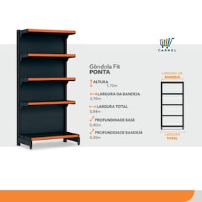 É facilmente montada por sistema de encaixe, sem uso de parafusos, inclinação da bandeja em 3 posições e fundo quadrado para melhor exposição. Possui bandejas reguláveis na coluna a cada 25mm, o que permite adição de bandejas extras. Sistema de reforço para maior capacidade de carga e estabilidade. Ponteira de coluna para proteção e durabilidade. Porta Etiquetas Smart, que não solta fácil.
