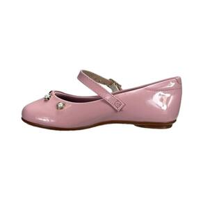 Sapatilha casual com cabedal em verniz e tira passando na parte superior do pé, item que da segurança para sua princesa. Lindos enfeites dourados e com pérolas na parte superior. Forro interno em tecido macio, palmilha e calcanhar acolchoado.