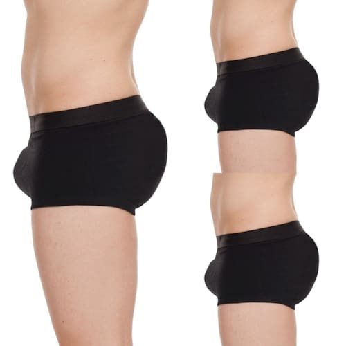 O enchimento (bojo) é inserido e fixo dentro da malha da cueca, evitando assim perda da estabilidade durante os movimento. Possui formato anatômico, fazendo com que se encaixe perfeitamente ao desenho do Glúteo. É indicada para todos os tipos de corpo. Aumento do Enchimento de 1,5 cm em média